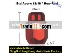 Wheel nuts Std Acorn 13/16"Hex-Red | PART# | Thread Size | Length | Hex | Plated | 711440RD | 7/16"-20 | 36mm | 21mm | Zinc or chrome | 711442RD | 1/2"-20 | 36mm | 21mm | Zinc or chrome | 711435RD | 10mmx1.25 | 36mm | 21mm | Zinc or chrome | 711444RD | 12mmx1.25 | 36mm | 21mm | Zinc or chrome | 711445RD | 12mmx1.50 | 36mm | 21mm | Zinc or chrome | 711450RD | 12mmx1.75 | 36mm | 21mm | Zinc or chrome | 711448RD | 14mmx1.50 | 36mm | 21mm | Zinc or chrome | 711473RD | 14mmx2.00 | 36mm | 21mm | Zinc or chrome |